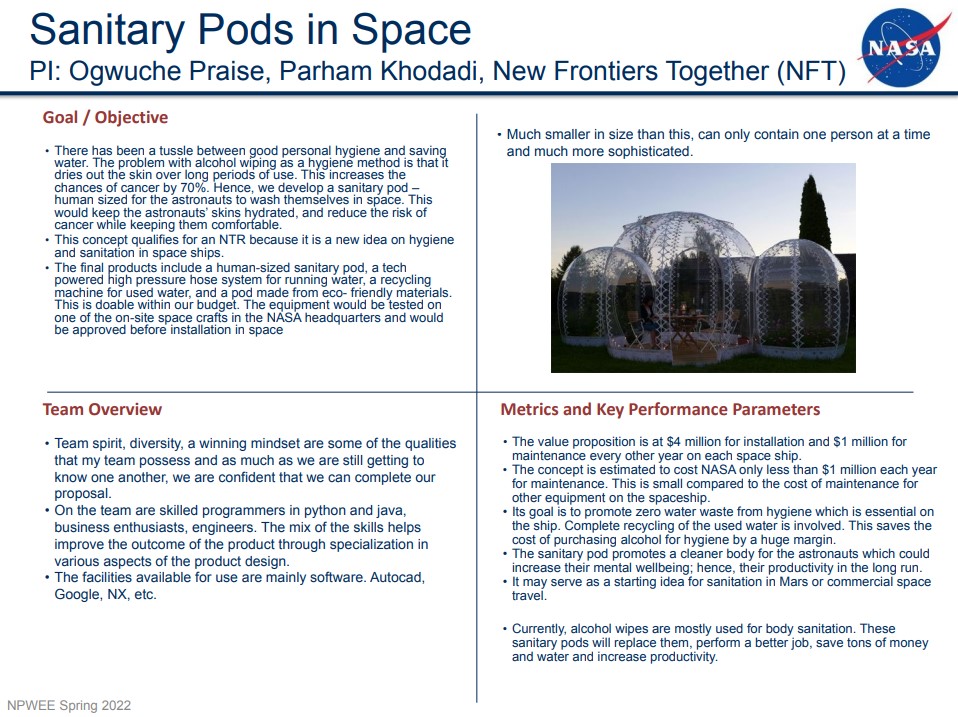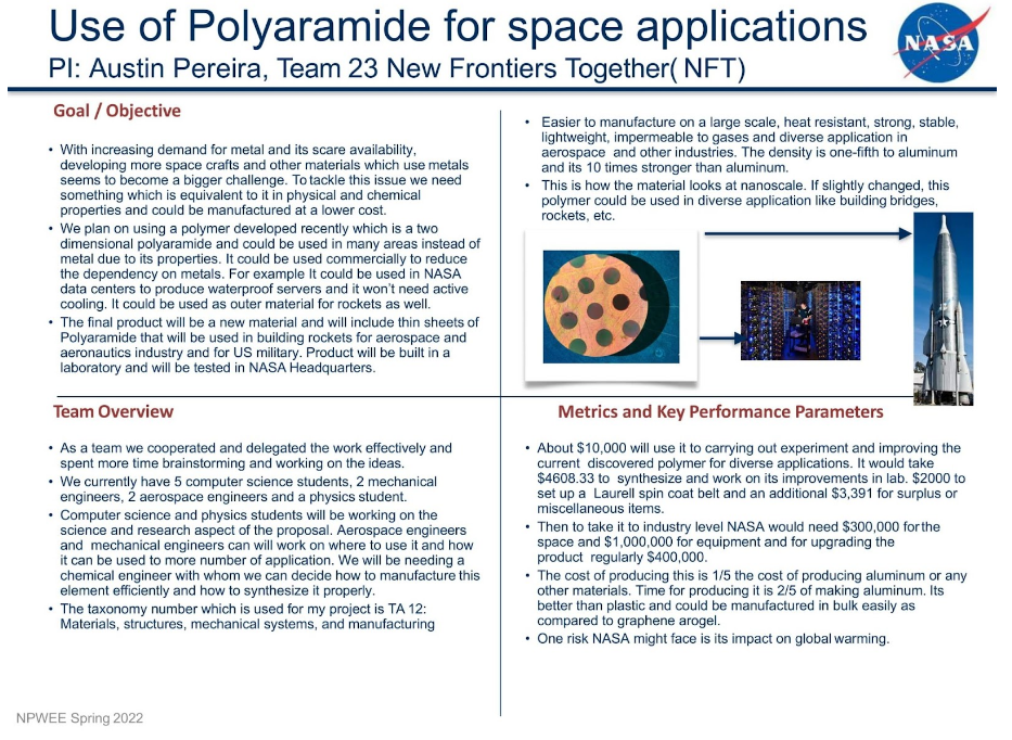 Lucy Student Pipeline Accelerator and Competency Enabler (L'SPACE) has the NASA Proposal Writing and Evaluation Experience (NPWEE), an intensive program designed to immerse participants in the NASA proposal development process. Over the course of five months, from January to May 2022, I developed a comprehensive manufacturing and prototyping workflow for 2DPA-1 polymer (an innovative material discovered at MIT) with applications in space environments. Learn more at L'SPACE.